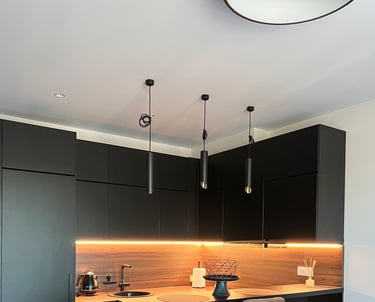Akcentinis Apšvietimas: Šilta LED juosta po virtuvės spintelėmis ne tik apšviečia darbinę zoną, bet ir pabrėžia medienos tekstūrą, sukurdama jaukią ir prabangią atmosferą.