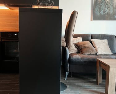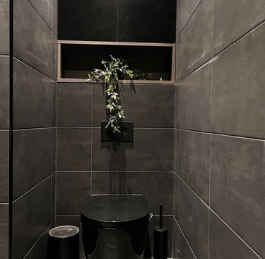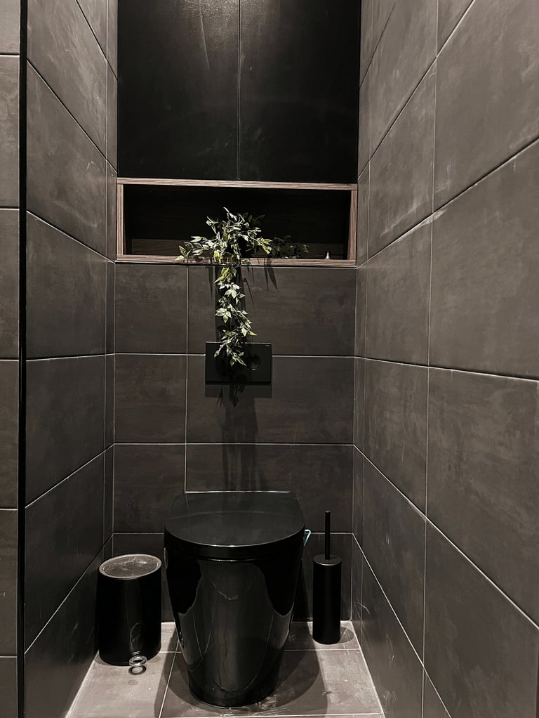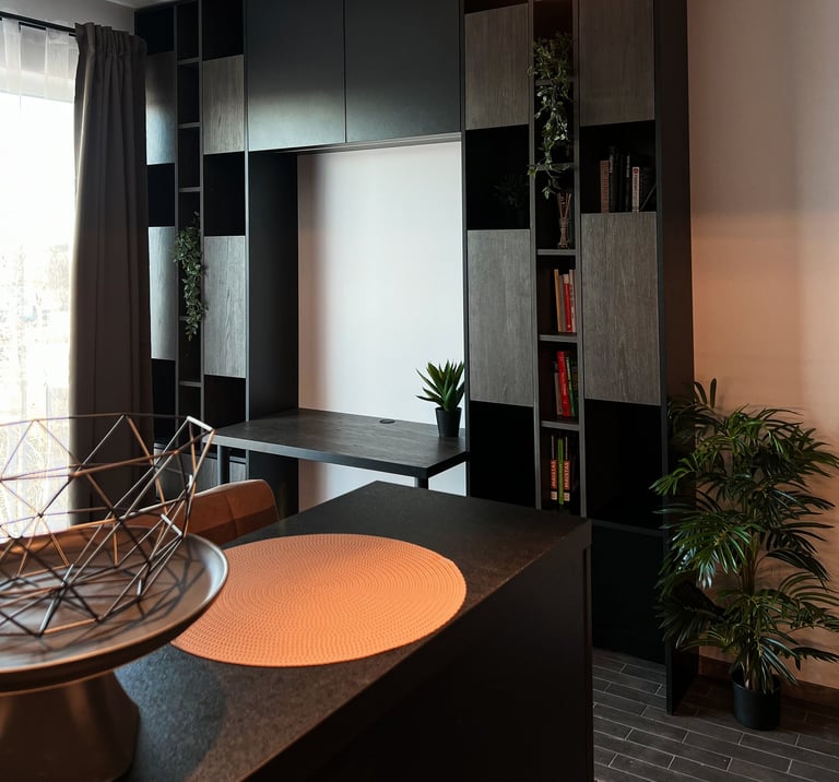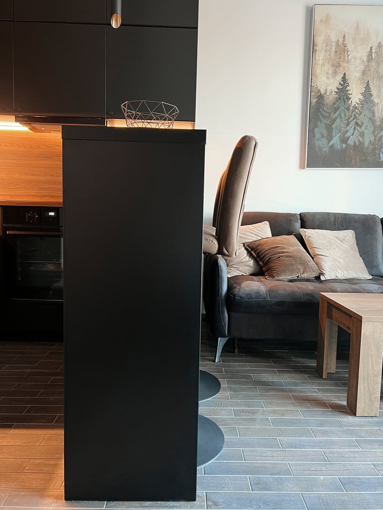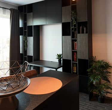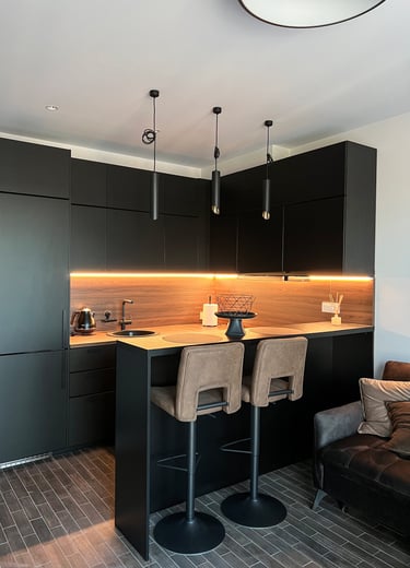 Pagrindinė koncepcija – kontrastas ir intymumas. Vyraujanti sodri matinė juoda spalva (virtuvės spintelės, spintos, vonios plytelės) suteikia erdvei rafinuotumo ir šiuolaikiškumo. Ši „tamsa“ subalansuojama dviem esminiais šviesos ir jaukumo šaltiniais: