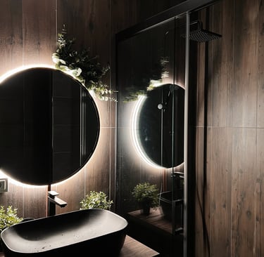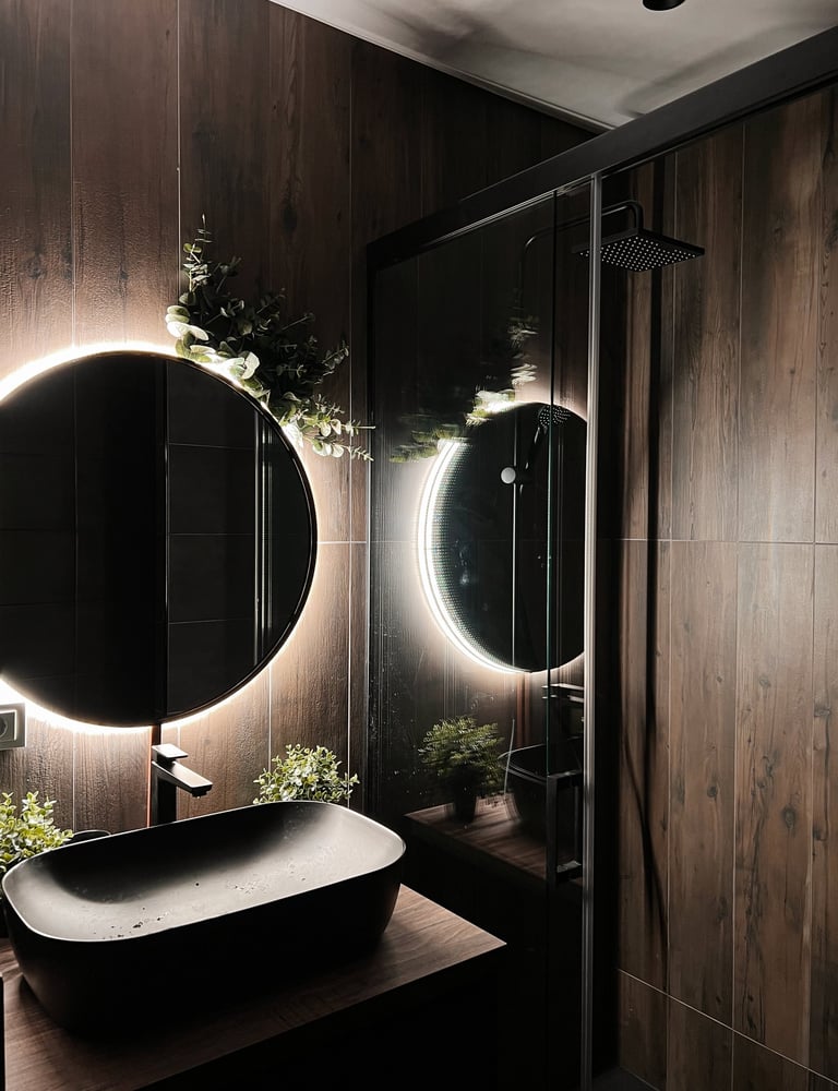 Kontrastas: Juodas apvalus veidrodis ir matinė juoda praustuvė ant šviesaus medinio stalviršio akcentuoja minimalizmą ir eleganciją.