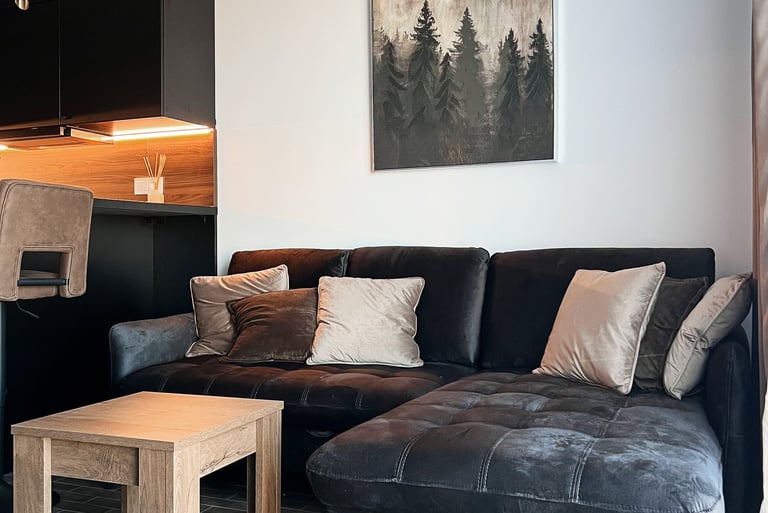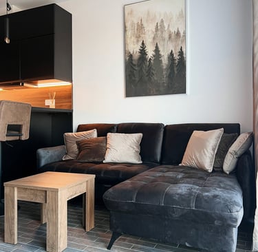 Natūrali Mediena (Riešutas/Tamsus Ąžuolas): Šilto atspalvio medienos tekstūra (virtuvės sienelė, vonios dušo zona, svetainės staliukas) įneša gamtos elemento, atliepiančio japandi filosofiją ir suteikiančio jaukumo.
