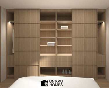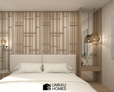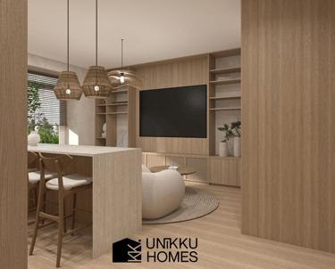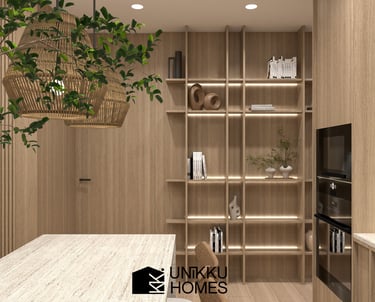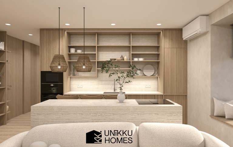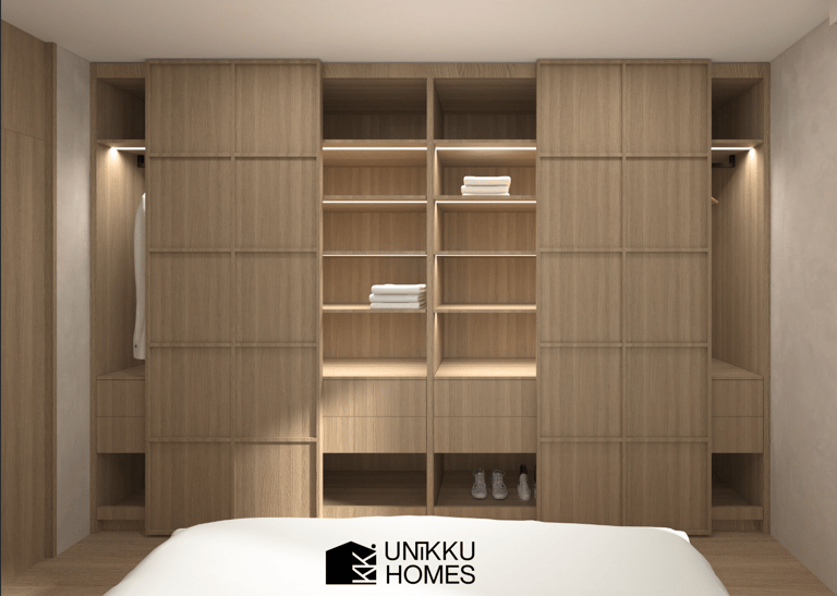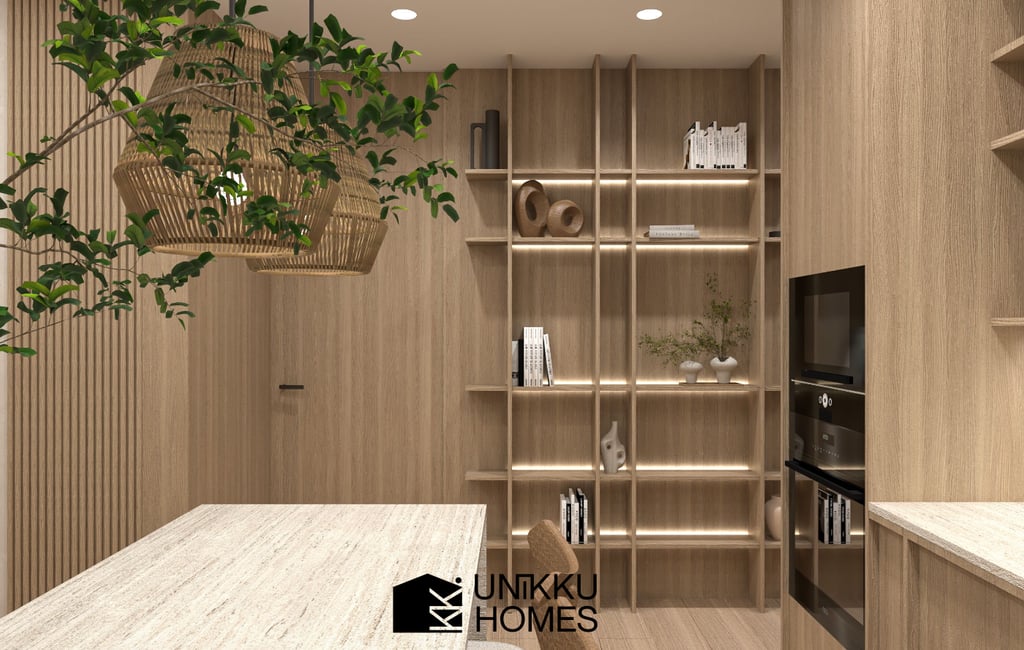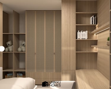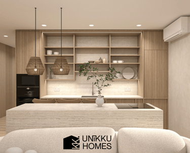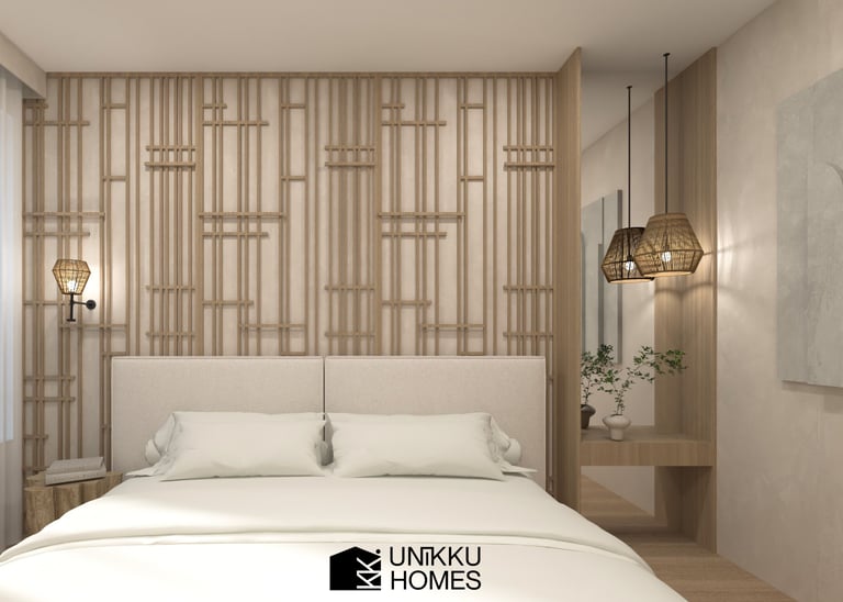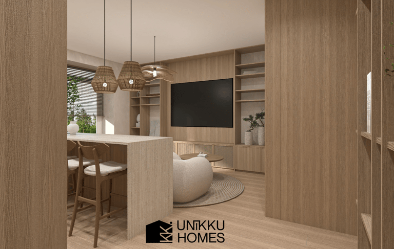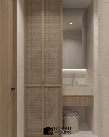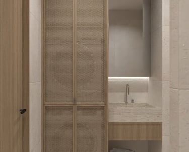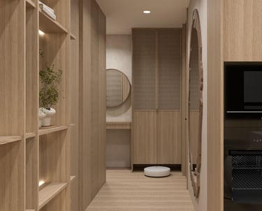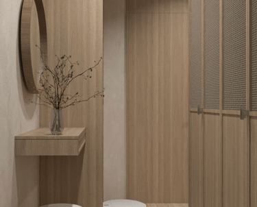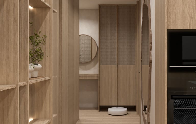 Visą butą jungia šilta, natūrali spalvinė paletė: šviesus medis, švelnūs smėlio ir pieno atspalviai, subtilios tekstūros. Čia nėra atsitiktinių sprendimų – kiekvienas paviršius, linija ir šviesos taškas turi savo paskirtį. Tai modernus japandi ir šiaurietiško minimalizmo dialogas: mažiau triukšmo, daugiau ramybės.