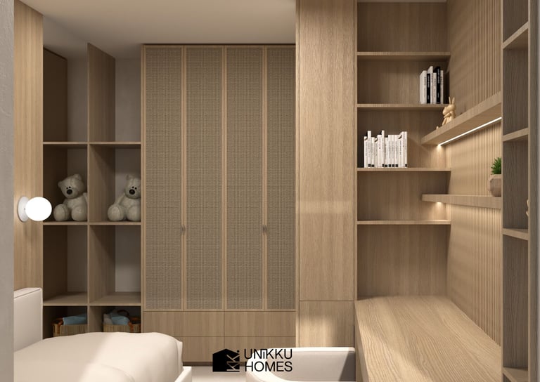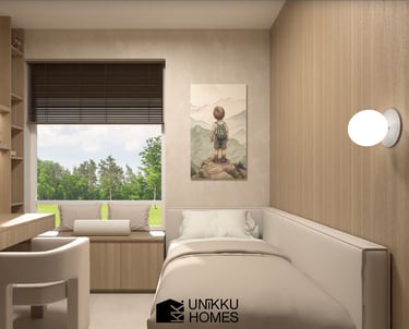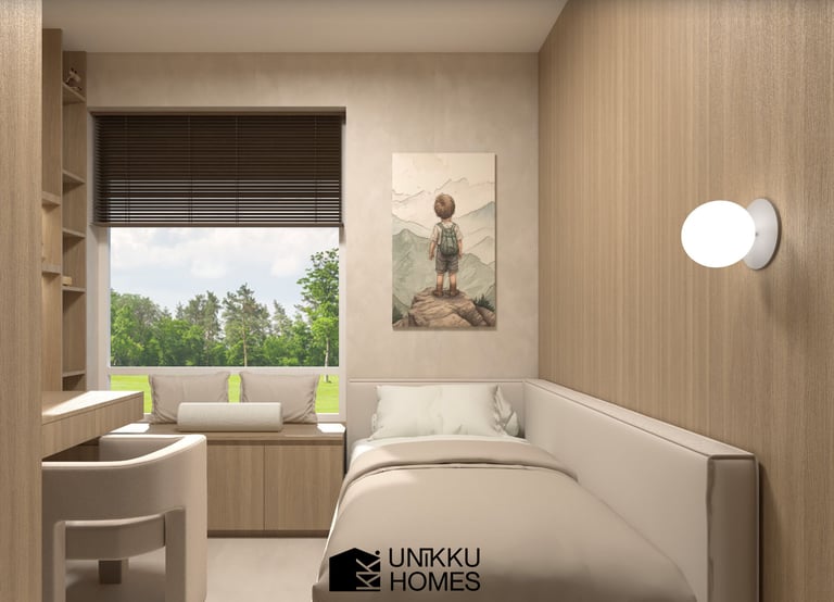 Trečiasis kambarys suprojektuotas kaip universali erdvė. Šiuo metu tai vaiko kambarys su darbo vieta, poilsio zona ir integruotais baldais, tačiau planas leidžia lengvai keisti paskirtį ateityje – be kapitalinio remonto.