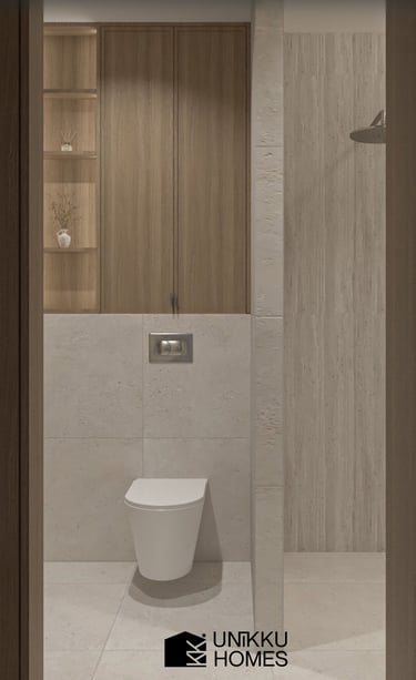 Akcentinė šviesa: Atvirose lentynose virš unitazo integruotas vertikalus apšvietimas išryškina dekoro elementus ir suteikia erdvei prabangos pojūtį.