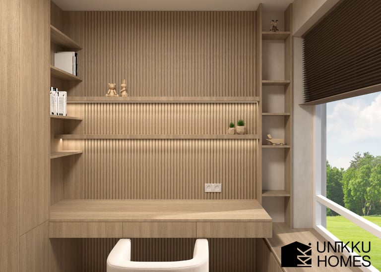 Langų nišos išnaudotos sėdėjimui ir daiktų laikymui, o baldai parinkti taip, kad neužkrautų nedidelės erdvės. Čia vėl matome tą patį Unikku Homes braižą: jokių perteklinių formų, tik tai, kas reikalinga.